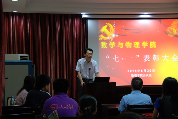 2014年6月30日上午10点半,嗨皮漫画 在基础楼二楼报告厅召开了庆祝建党93周年暨“七一”表彰大会,校党委组织部副部长刘治国、院党委书记李宇凯、副院长张光勇、副书记李杰出席表彰大会。参加表彰大会的还有教工党员和学生党员代表。
