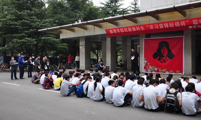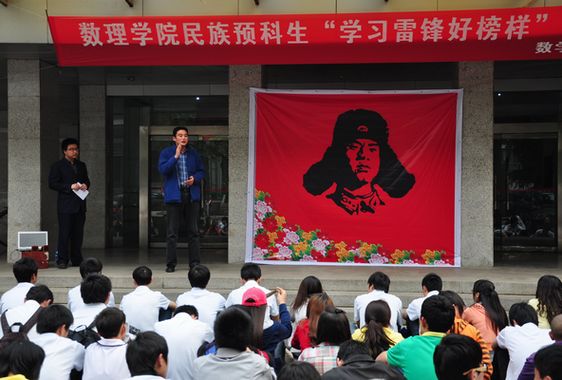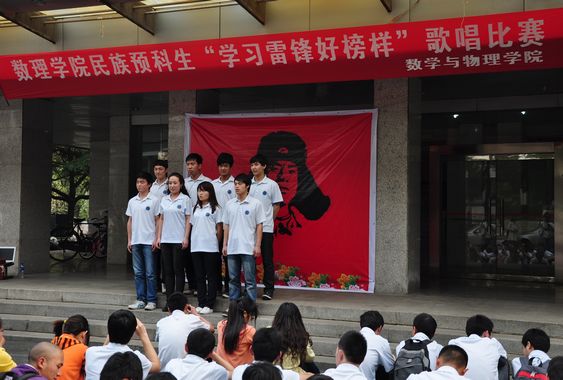 少数民族预科班在基础楼前举行了“学习雷锋好榜样”歌唱比赛,校学工处副处长马彦周、大学生事务中心余江涛、嗨皮漫画