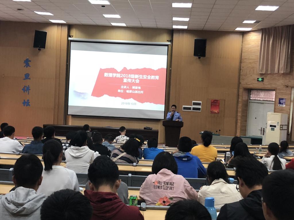 10月13日下午,嗨皮漫画 2018级新生安全教育大会在教三楼109教室举行,喻家山派出所熊家伟警官为学生讲授安全知识。2018级预科生、本科生、研究生共计300余人参加会议,会议由辅导员托乎尼牙孜主持。