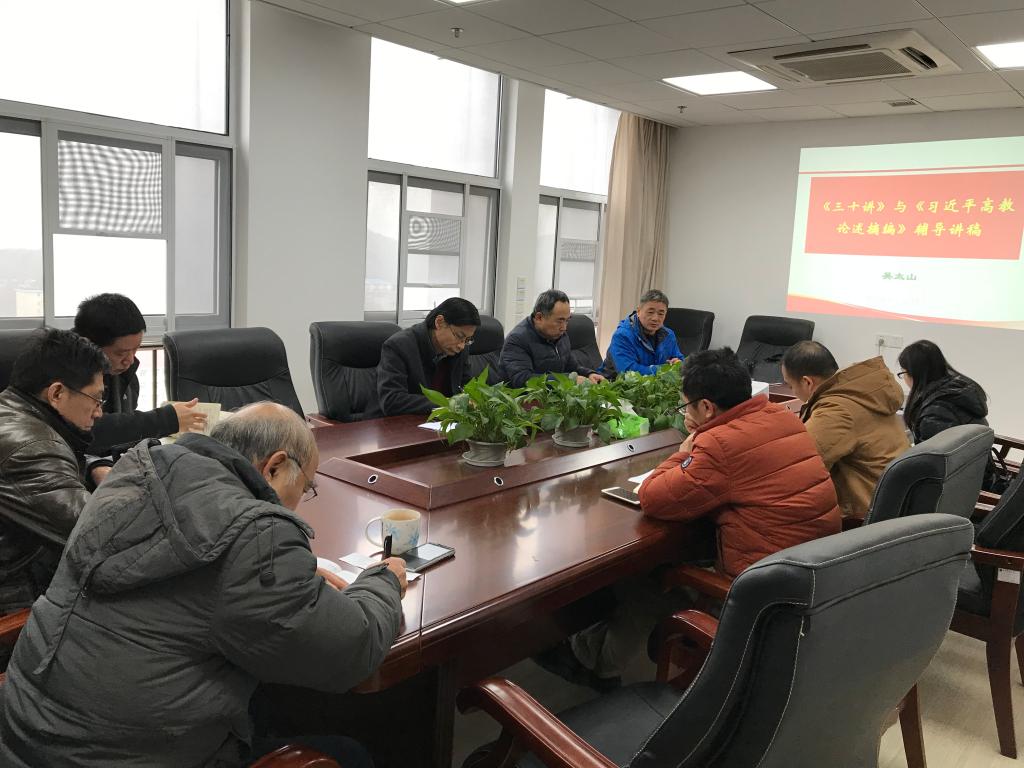 接着,吴太山带领与会人员学习了《习近平新时代中国特色社会主义思想三十讲》和《习近平总书记关于高等教育重要论述摘编》。通过一张结构树图,详细介绍了《习近平新时代中国特色社会主义思想三十讲》一书中三十个专题的主要内容,然后精选了一些古典名句、经典妙喻,带领大家深入学习相关章节的重要内容和精神实质。结合领导干部要“五个过硬”和“三个一以贯之”,学习了习近平总书记去年1.5讲话精神。接着学习了十八大以来,习近平总书记对中国高等教育发展和高校思想政治教育工作的一系列重要论述。