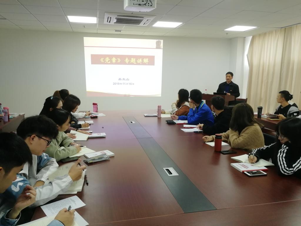 11月16日下午,嗨皮漫画 第66期入党积极分子培训班第二讲在东区教学综合楼A1505会议室举行。本次党课由学院党委书记吴太山讲授《党章》专题。院学生党建办主任孙宇涛主持。