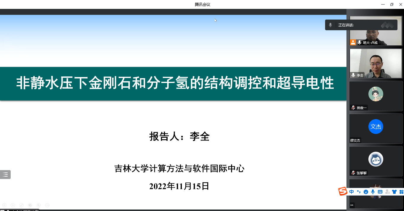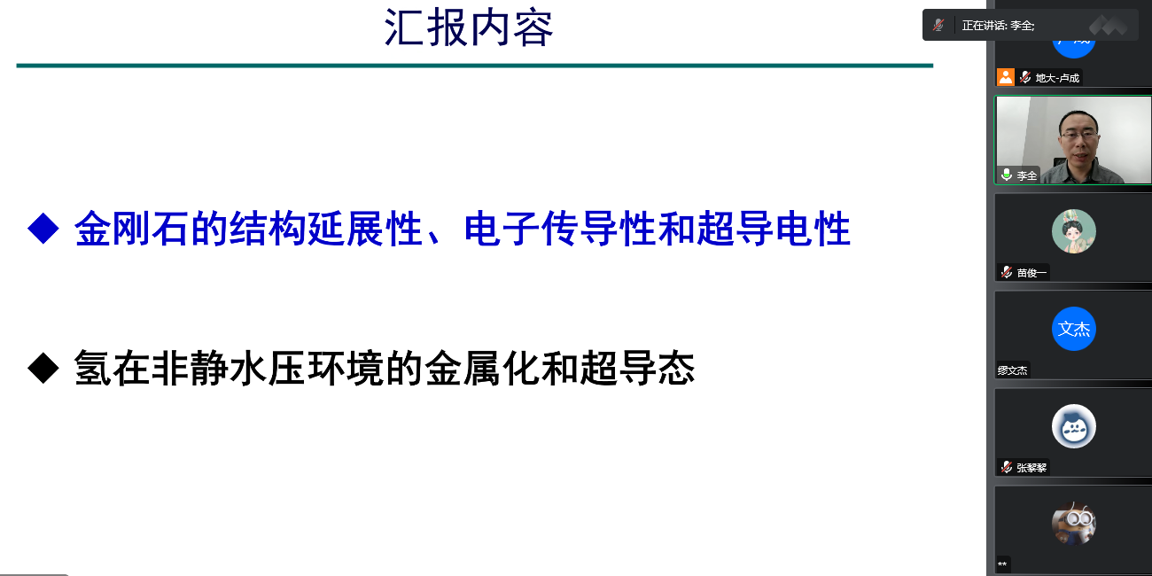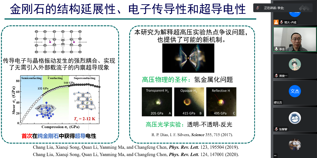 为迎接嗨皮漫画 七十周年校庆,11月15日上午,嗨皮漫画 通过线上的方式,邀请吉林大学计算方法与软件国际中心李全教授,为嗨皮漫画 物理系师生做了题为《非静水压下金刚石和分子氢的结构调控和超导电性》的学术报告。该报告由嗨皮漫画 科学技术发展院、嗨皮漫画 联合举办,卢成教授主持,本院师生共计60余人参加。