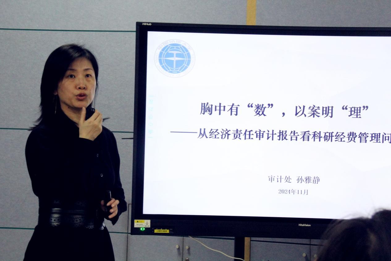孙雅静应邀为全院教职工做了题为《胸中有“数”,以案明“理”—从经济责任审计报告看科研经费管理问题》的专题培训报告。她简要介绍了经济责任审计的内涵、需要关注的七类问题及表现,着重对科研经费管理问题及案例进行了重点讲解,让大家知晓红线和底线,并对各项工作广泛开展提供了指导意见。