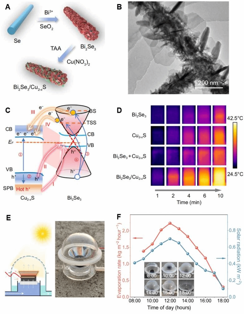 图1. (A)合成过程示意图。(B)Bi2Se3/Cu2-xS纳米复合结构的透射电子显微镜图像。(C)Bi₂Se₃/Cu₂₋ₓS杂化物中的载流子弛豫机制。(D)Bi₂Se₃/Cu₂₋ₓS杂化物的热图像。(E)自然光照射下的室外集水装置。(F)室外集水过程中水产量与太阳辐照强度随时间的变化关系。