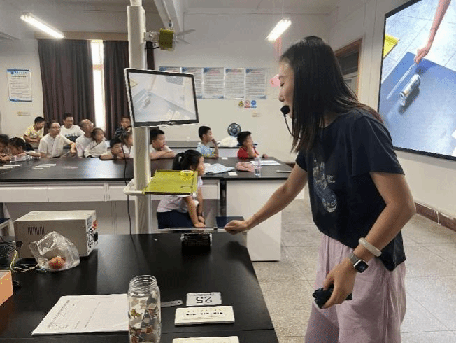 在电磁实验室,何开华教授化身“科学魔术师”,带领孩子们走进电磁的奇幻世界。雅各布天梯通电后,紫色电弧如火焰般逐级攀升,引得孩子们齐声惊呼:“好像会跳舞的闪电!”在音乐磁力线装置前,回形针在磁场作用下随音乐节奏“起舞”;辉光球中,蓝色电晕如星云般蔓延,当小手触碰玻璃表面,电流如灵蛇般追随指尖游走,孩子们兴奋地交换体验,感受电流的神奇。水力发电机与磁悬浮马达的联动展示,让孩子们直观理解了能量转换,“原来光能让小马达飞起来!”一个孩子指着悬浮转动的马达惊叹道。
