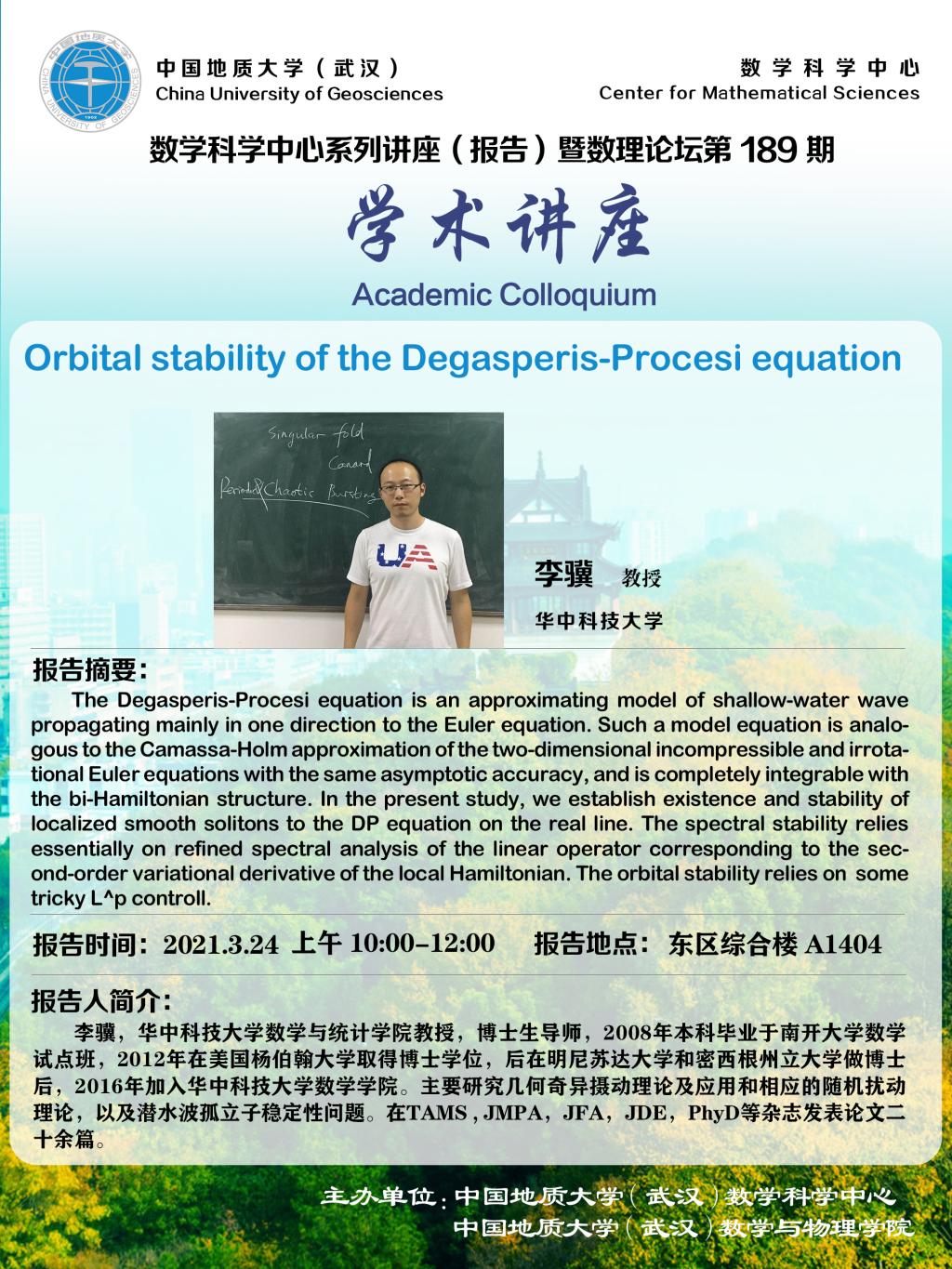 "数理论坛"第189期暨数学科学中心系列讲座(报告):Orbital stability of the Degasperis-Procesi equation