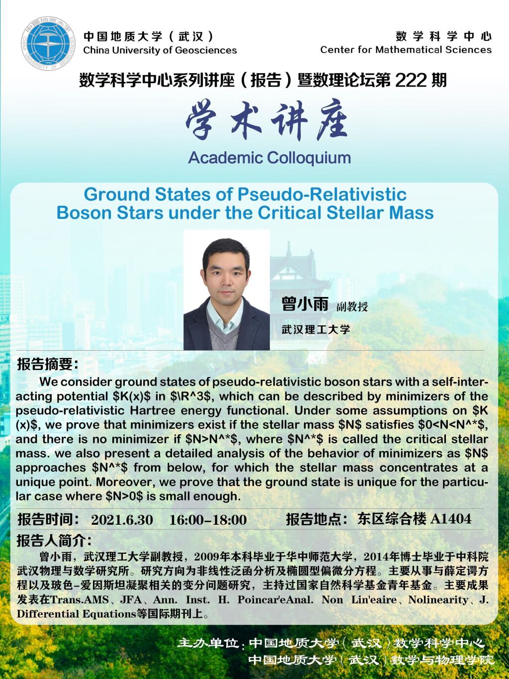 "数理论坛"第222期暨数学科学中心系列讲座(报告):Ground States of Pseudo-Relativistic Boson Stars under the Critical Stellar Mass