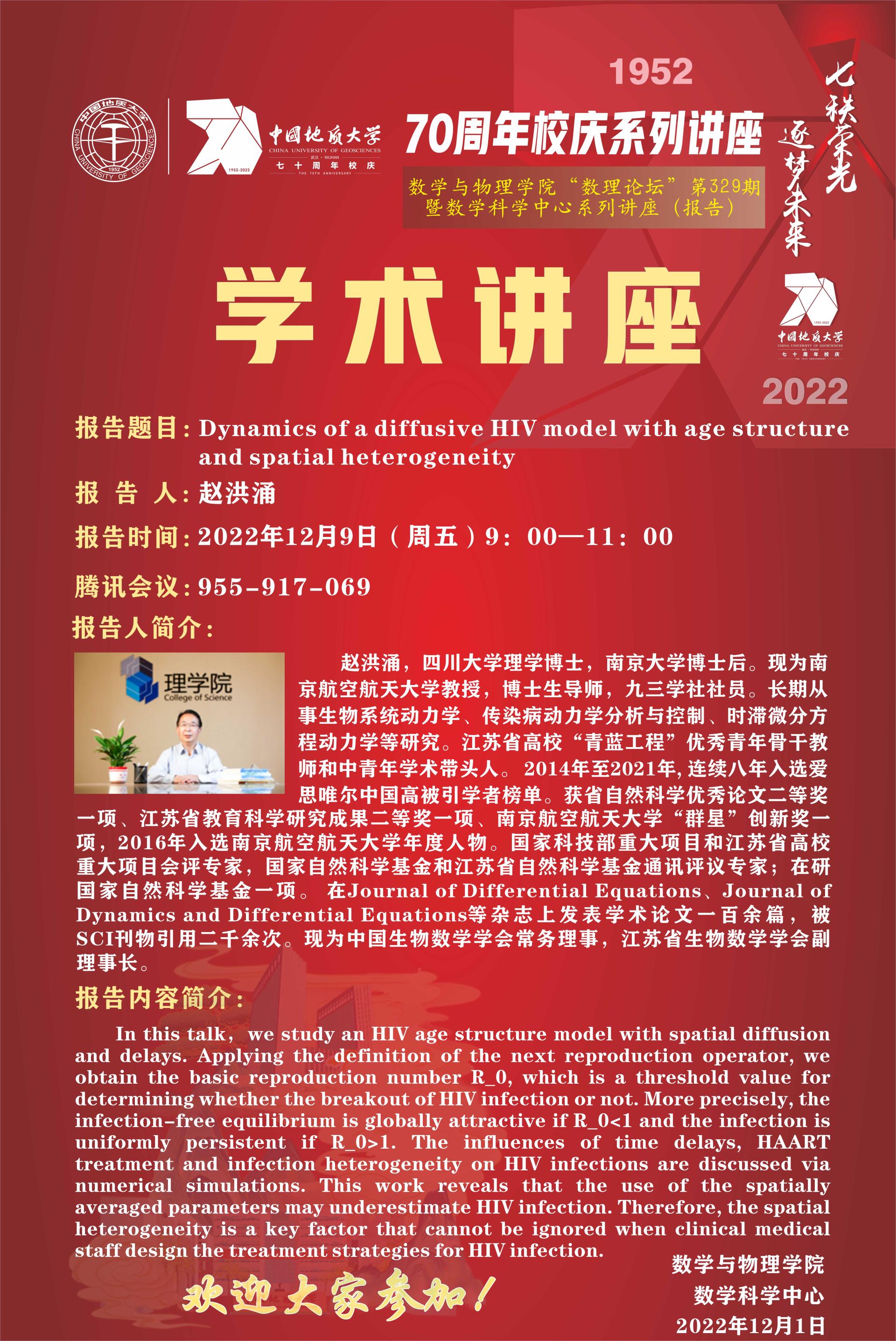 "数理论坛"第329期暨数学科学中心系列讲座(报告):Dynamics of a diffusive HIV model with age structure and spatial heterogeneity