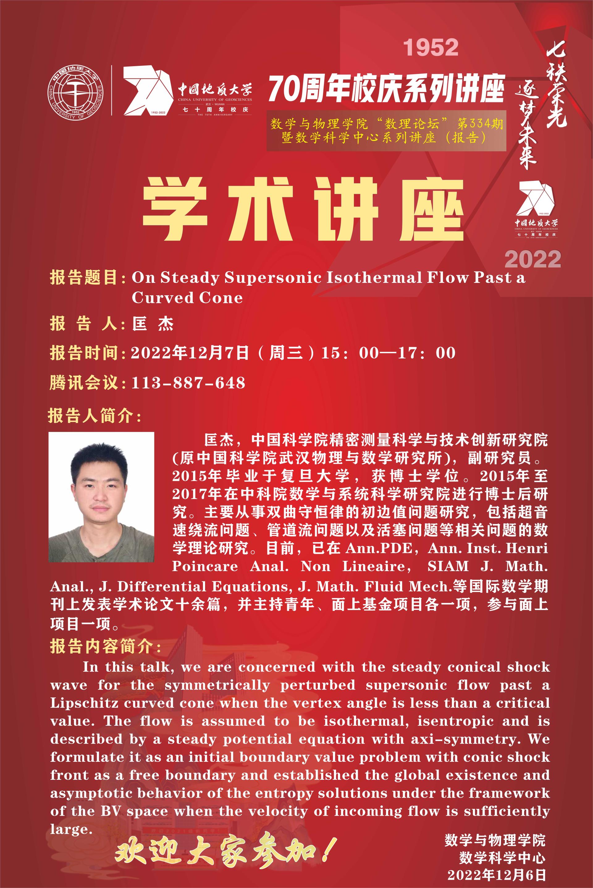 "数理论坛"第334期暨数学科学中心系列讲座(报告):On Steady Supersonic Isothermal Flow Past a Curved Cone