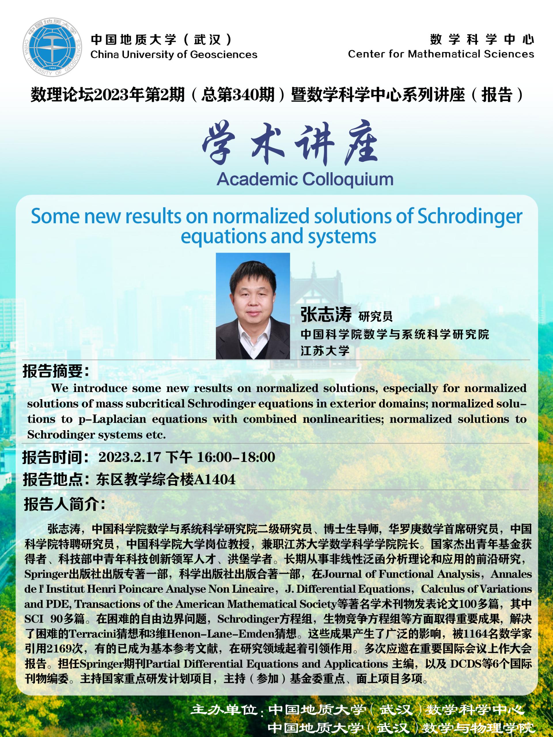 2023年2月17日张志涛研究员学术讲座:Some new results on normalized solutions of Schrodinger equations and systems