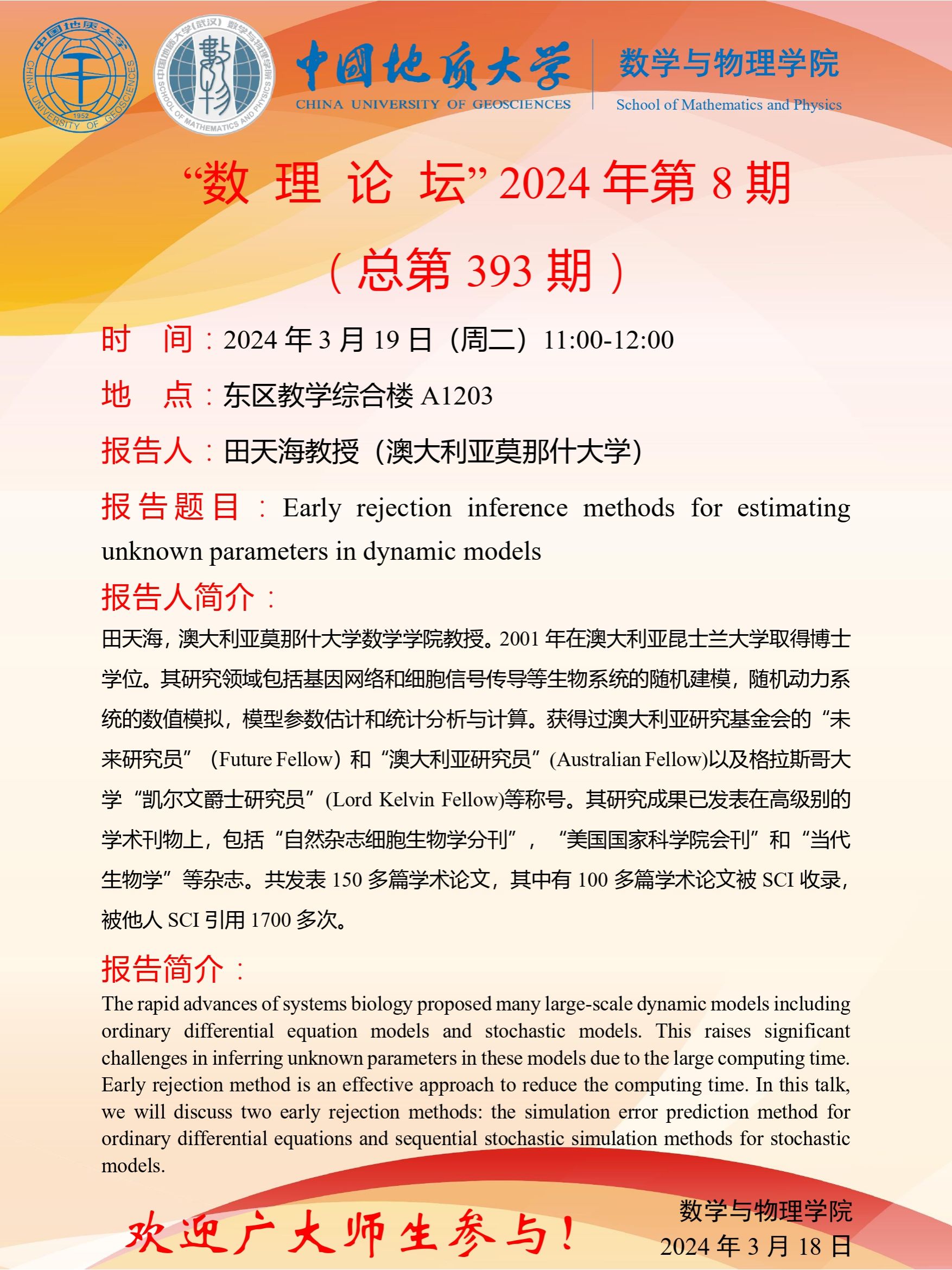 2024年3月19日田天海教授学术讲座:Early rejection inference methods for estimating unknown parameters in dynamic models