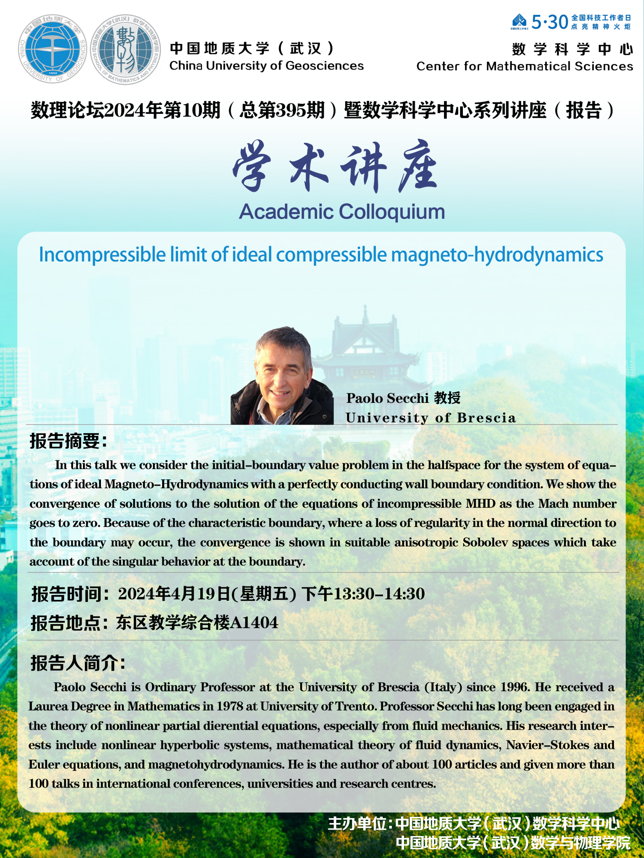 2024年4月19日Paolo Secchi教授学术讲座:Incompressible limit of ideal compressible magneto-hydrodynamics