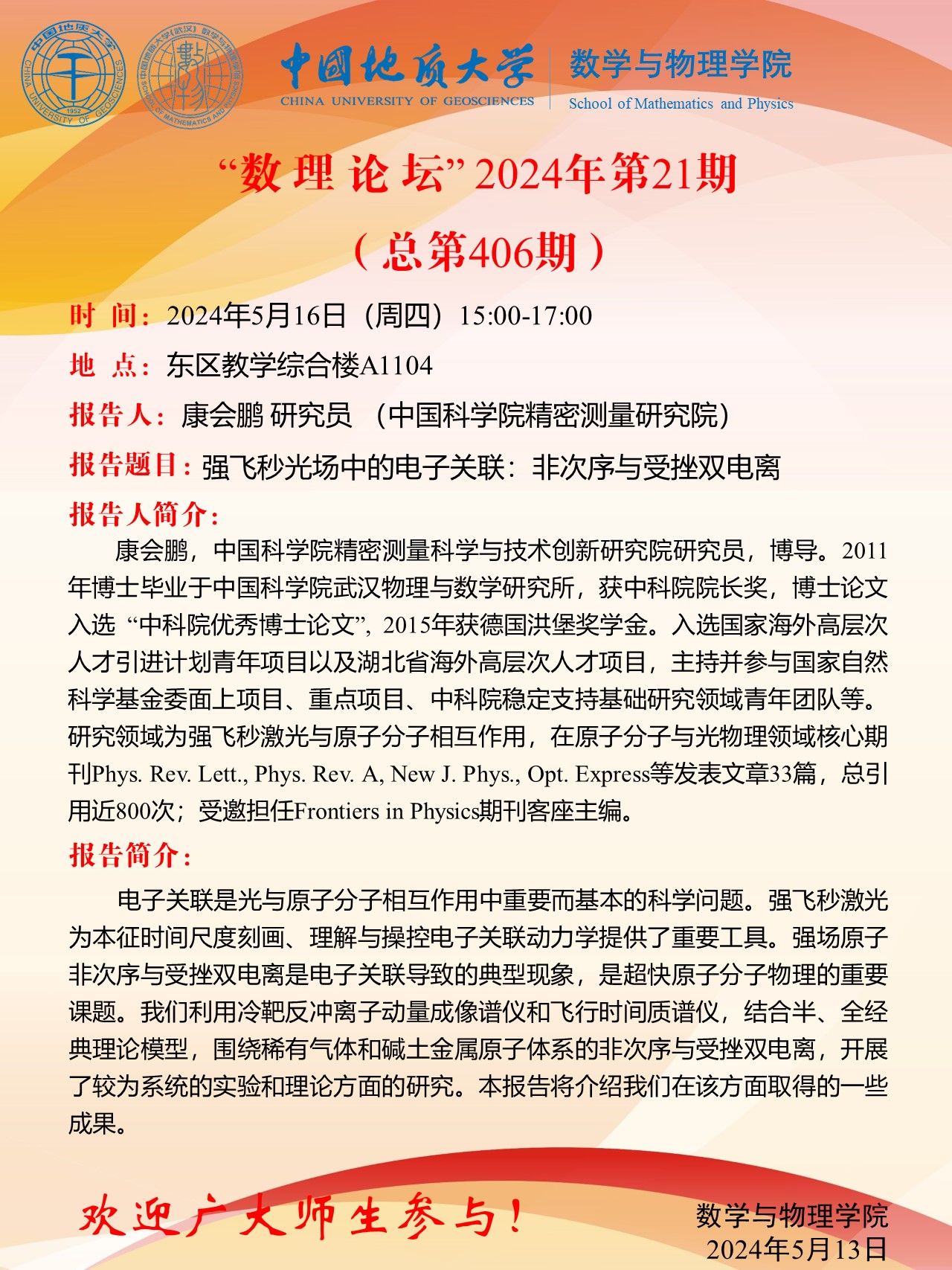 2024年5月16日康会鹏研究员学术讲座:强飞秒光场中的电子关联:非次序与受挫双电离