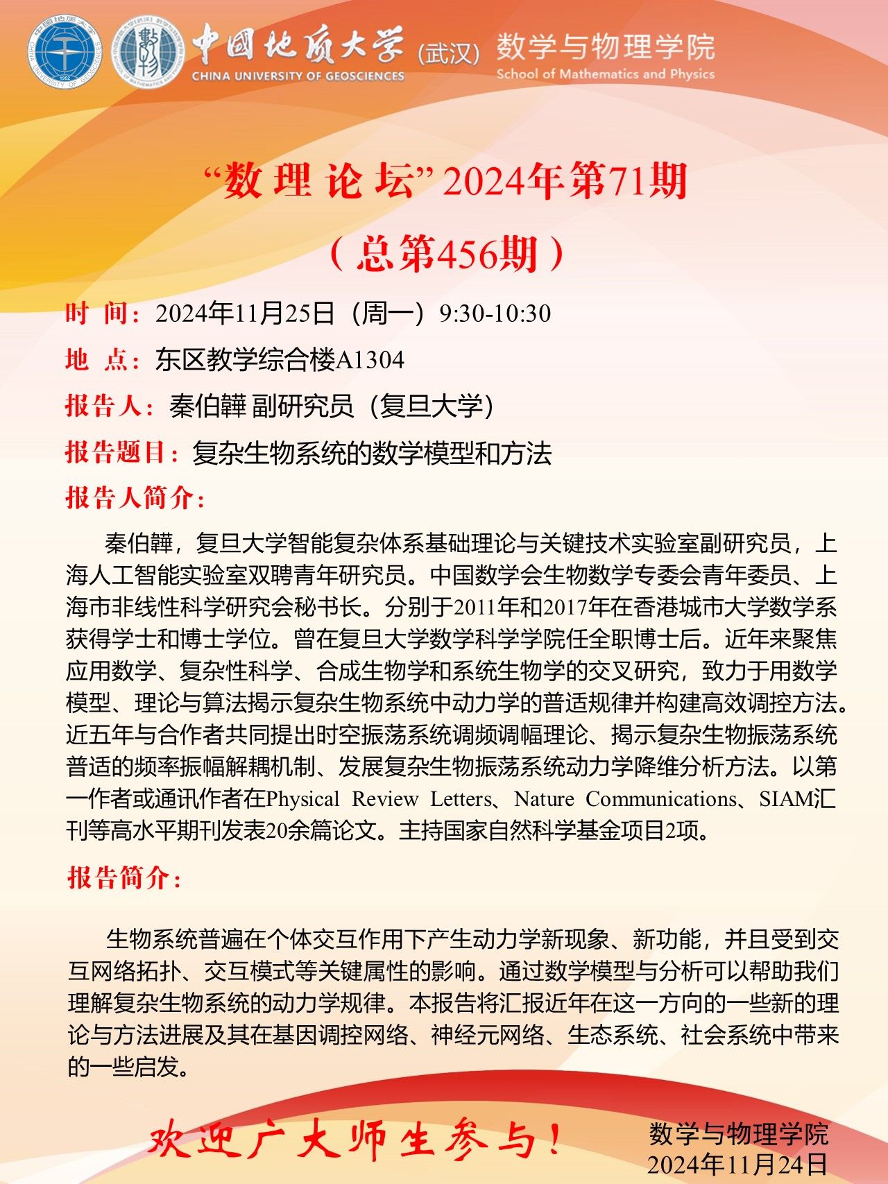 2024年11月25日秦伯韡副研究员学术讲座:复杂生物系统的数学模型和方法