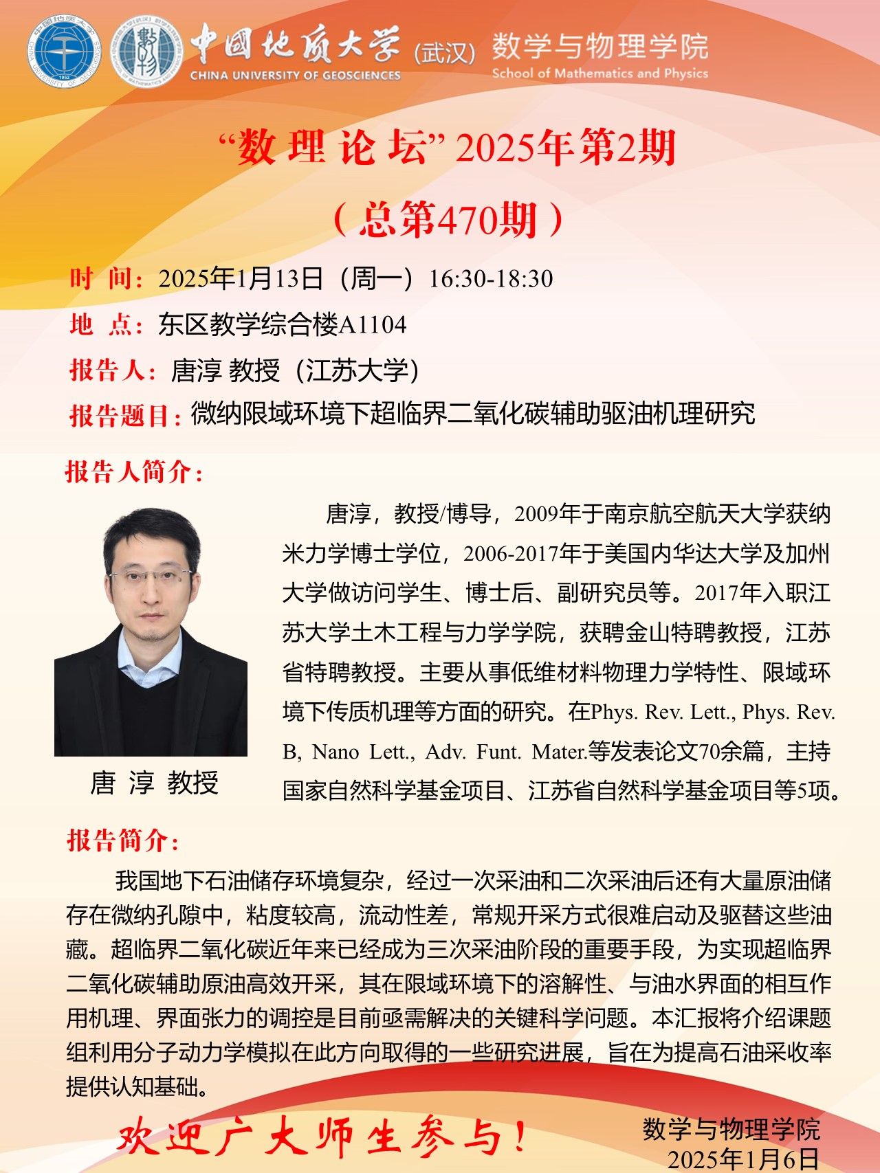 2025年1月13日唐淳教授学术讲座:微纳限域环境下超临界二氧化碳辅助驱油机