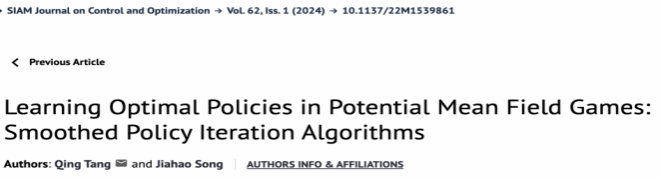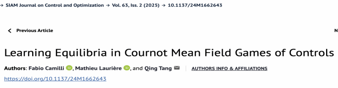 嗨皮漫画 信息与计算科学系教师汤庆博士作为通讯作者的工作 “Learning Equilibria in Cournot Mean Field Games of Controls” 最近发表于SIAM Journal on Control and Optimization。