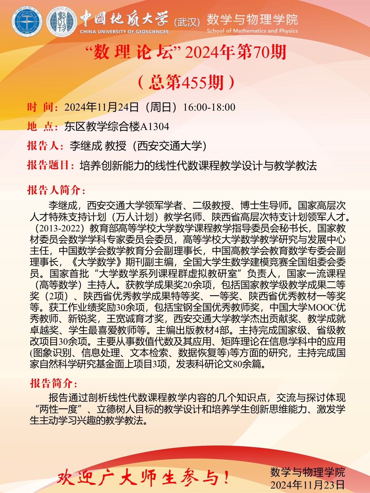 2024年11月24日李继成教授学术讲座:培养创新能力的线性代数课程教学设计与教学教法